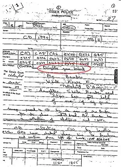 The radio log is headed, "Daughter gone berserk": "Mr Bamber, White House Farm, Tolleshunt d’Arcy—daughter Sheila Bamber, aged 26 years, has got hold of one of my guns." It adds: "Message passed to CD by the son of Mr Bamber after phone went dead." It goes on to say: "Mr Bamber has a collection of shotguns and .410s", and it includes White House Farm's telephone number. The final entry says: "0356 GPO [the telephone operator] have checked phone line to farmhouse and confirm phone left off hook." The radio log shows that a patrol car, Charlie Alpha 7 (CA7)—not Charlie Alpha 5, as mentioned in the event log—was sent to the scene at 3:35 am.[93]