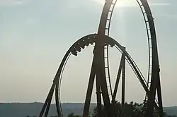 One of Wildfire's trains navigating the Immellmann loop, with the vertical loop in the foreground | |
