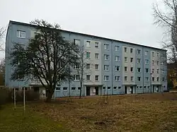 A commission for a series of houses resulted in the design known as the EW58,[1][2] which went on to become widely popular, with about 500,000 being built in the GDR beginning in 1958. The house was relatively affordable, often constructed by the owners with the help of neighbors, and has an important role in the material form of the country's postwar peri-urban and rural life.[3][4] The EW58's simple design was frequently modified by its owners in an ad-hoc fashion with individualized elements such as enlargements, finished basements, and balconies.[2][3] By 1959 Stallknecht was a researcher for the architect Hermann Henselmann at the Bauakademie, focusing on "industrial" building for providing rapid access to new housing for large numbers of people.