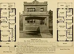 Although, in the opinion of his biographer Neal Vogel, some of his designs were "lackluster versions" of Queen Anne or American Foursquare designs, some of his designs reflect the Prairie School aesthetic and his publications helped to spread it across the United States in the early 20th century.[2] Radford embraced what were then modern innovations, with books on construction types that were just coming into use such as his 1700-page-long 1910 Radford Cyclopedia of Cement Construction which dealt in the use of concrete and whose articles were written by a team of experts on the subject.[2]