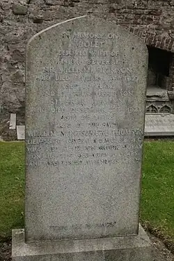 He died on 23 July 1963. He is buried in Kinloss Abbey but is also memorialised on a family stone within the eastern enclosure at St Machar's Cathedral.[1]