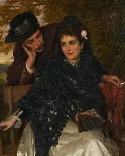 After recovering from bankruptcy in 1863,[25] by the late 1860s he was based in London and had adopted his more well-known professional name which he used thereafter.[2][26] He continued to exhibit at the Royal Academy of Arts and British Institution (Tryste) in 1867, and at the Society of British Artists (The First Letter) in 1868.[2][27][28] Subsequently, he also exhibited at the Walker Art Gallery Liverpool, Manchester Art Gallery, Royal Birmingham Society of Artists and Royal Glasgow Institute of the Fine Arts.[3] His favoured exhibition venue was the Royal Academy of Arts. He exhibited 15 more works there starting with A thing of beauty is a joy for ever and Forget me not in 1867, and finishing with Mrs Oliver Williams in 1897.[2][3][29] It is recorded that at least one of his paintings had sold in one of the major auction galleries for more than £100 during the 1970–1975 period.[3]