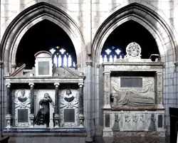 He died on 9 October 1604, in the year of his seventieth birthday, at his house at Little Fulford (renamed Shobroke Park in the early 1800s, demolished)[15] east of Crediton in Devon. His monument exists in Crediton parish church to the north of the chancel, showing a life-like effigy of his recumbent figure his head propped up on his hand. He had served at the Exchequer for eleven years and nine months, and his funeral and burial in Crediton Church appears to have been a significant event, as it was well attended, according to Prince not only by "The gentry, clergy, and others in these parts, but also with heralds at arms, marshalling all according to their rank and place".[3]