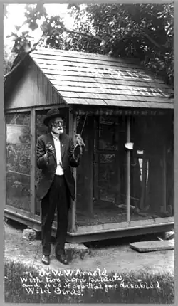 While still operating his medical practice, he and his wife operated a bird hospital for wild and domestic birds beginning around 1913.[10][12] He treated wounded birds, set broken bones, and administered medicine; when they were healed, he released them.[10] For instance, a hundred robins, as well as several other birds, were brought to Arnold after a severe hail storm. Some of the birds were blinded, some had broken wings, and some had feathers stripped off of their heads.[2] He provided a home to crippled birds that were unable to care for themselves.[2] Children helped care for the birds.[10] Visitors spread the word about his work around the country.[12]