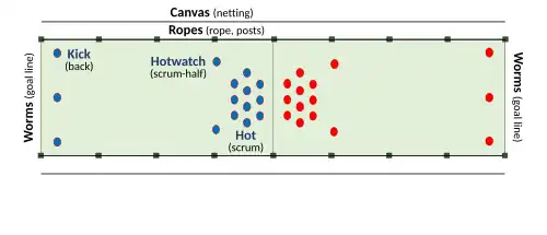 The game somewhat resembles rugby football, as players can kick the ball or run with it.[1] The players attempt to score by kicking the ball over the end of the pitch.[2] Tatler quotes a pupil's description of it as "our combination of football and rugby, likened to an English bulldog playing with a ball".[3] The Financial Times commented that the game could substitute for the Ancient Greek game of Pankration, but that a "Kasparov-like mind" was necessary to cope with the ever-changing rules.[4] The aim of the game is to kick the ball (an over-inflated soccer football) into worms – the area at either end of canvas. Unlike in Rugby football, a player need only kick the ball across the worms line to score.[5]