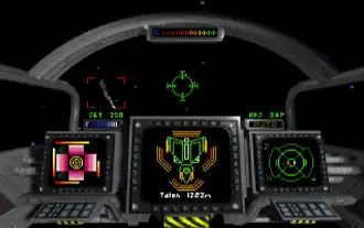 When flying, the main view is a first-person look from inside the cockpit at the screens (HUDs) and the space before the ship. Space combat simulation is similar to the style of other Wing Commander games of its time. On planets and bases, a static overview/first-person-view is used to show the rooms and interact with people. Menus are used for buying, selling, or taking missions from the mission computer.