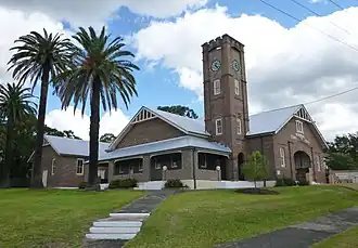 Designed by local architect James Thomson Chambers, it is rare and possibly unique within NSW as an institutional building designed in the Interwar Californian Bungalow architectural style. This style is characterised by its earthy appearance, brown brick work, low-pitched street-facing gables with decorative timber inserts, corrugated iron roof and substantial masonry piers on its verandahs.[15] It also displays aspects of the Federation Free Style,[17] characterised by the asymmetrically positioned landmark tower; and the Federation Arts and Crafts style, characterised by the large arch over the entrance and decorative painted wood work.[18] Chambers' daughter's history of his career states: ':Much of Chambers' work espouses the philosophies used by the Federation Arts and Crafts Movement, which can be seen in his design of the Memorial Town Hall, with its asymmetric placement of the clock tower; its open vestibule area making it a place for the people; as well as the use of local product, tradesmen and artisans... The idea that the landscaping was part of the overall design of a building was favoured by the Arts and Crafts Movement... Buildings in the federation Arts and Craft style were... not merely facades, but rather were built "in-the-round", in artful informality.'[1][19]