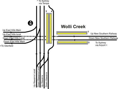 Wolli Creek railway station is located at the junction of the Airport and Illawarra lines, serving the Sydney suburb of Wolli Creek. It is served by Sydney Trains' T4 Eastern Suburbs & Illawarra Line, T8 Airport & South Line services and NSW TrainLink's South Coast Line services.