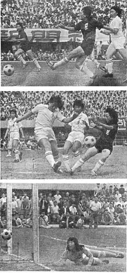 The first women's football match on Korean soil took place on 28th June 1949 as part of the 2nd National Women's Sports Festival, held at Seoul Stadium (later known as Dongdaemun Stadium).[7] Three girls' middle school teams (Muhak, Myungsung, and Seoul Central) and a team from Daegu Girls' High School participated in the girls' football tournament.[8][9] A rule was added stating that handling the ball would not be considered a foul if used to block the ball from hitting the chest.[6] Women's football proved popular, with the newspaper at the time reporting that a large crowd gathered to see Muhak beat Myungsung 2-1 in the final.[10]