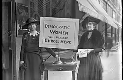 In 1910, the Equal Suffrage League (ESL) was formed with Florence Wyman Richardson as president.[183] Three other state clubs merged to form the Missouri Equal Suffrage Association (MESA).[184] During the Woman Suffrage Procession, Missouri was well represented and had an all-female marching band that calmed the rowdy crowd.[185][186] During the rest of 1913 and 1914, suffragists held conventions and parade.[187][188][189] During the 1916 Democratic National Convention, suffragists held a "walkless, talkless parade."[190][191][192] In 1919, women's right to vote for presidential electors was recognised.[193][194] The Nineteenth Amendment was ratified by Missouri on July 2, 1919.[195] The League of Women Voters of Missouri was formed in October 1919.[196]