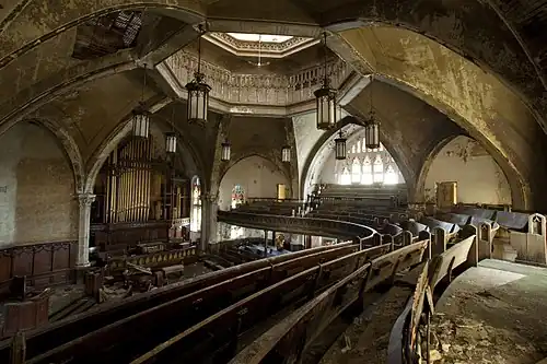 Membership surpassed 2200 by 1921. However, by the 1950s, many members were leaving Detroit for the northern suburbs.[4] Woodward Avenue Presbyterian Church began to struggle, with fewer than 1000 members in 1961 and only 404 in 1971. In 1981, Woodward Avenue Presbyterian merged with Covenant Church. The combined churches still had fewer than 500 members, and by 1991 there were only 210. In 1993, the congregation split from the Presbyterian church, eventually becoming the Abyssinia Interdenominational Church under Pastor Gary Douglas. The church closed on the death of the pastor in 2005. Woodward Avenue Presbyterian was abandoned, and has fallen into disrepair.