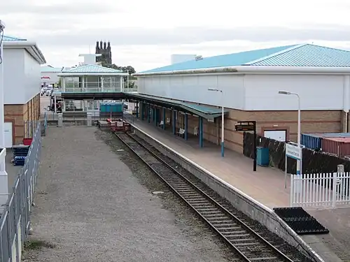 In 1998, a large shopping centre was to be built on the entire area, and the station was moved west by 400 yards (370 metres).[9] The local rail users group tried to prevent this, but failed. They did however get a large station building constructed, compared to the prefabricated open concrete shelter it replaced, and the new station was opened on 23 November 1998.[9] One of the conditions the Rail Users group gave on the relocation was that if needed, space be left for future doubling of the track and a second platform, which was complied with.[10]