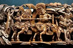 Wooden sculpture of duel between Xu Chu (right) against Ma Chao (left) in fictionalized Three Kingdoms novel