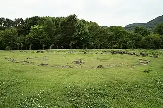 The stone circle was discovered in 1990 during construction-related survey and excavation in what was then the village of Takizawa.[1] Extending some 20 metres (66 ft) north to south by 15 metres (49 ft) east to west, the circle comprises a number of variously shaped groups of stones.[1] Scientific analysis of the numerous man-made holes beneath the stones indicates that this was a communal burial and ritual site, facing Mount Yaji (528 metres (1,732 ft)).[1][4] While there were further graves without a stone marker, the absence of postholes or other evidence for dwellings in the circle's vicinity demonstrates the distinction and separation of spaces for living from those for burial and spirituality.[1][5] A pathway for transporting stones to the site was also found, along with ceramics and lithics.[1][5][6]