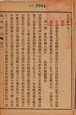 Comprising sixteen chapters[3] and twenty-one poems,[6] Zhulin yeshi was written in the late Ming dynasty by an anonymous writer using the pseudonym Chi Daoren (痴道人),[7] translated into English as "Infatuated Moralist"[7] or "Man of the Crazy Way".[4] The novel was published in Suzhou and likely had its first printing sometime between 1610 and 1620, although it was subsequently banned by the Qing government.[7]