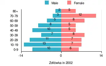 According to the 2002 Poland census, there were 132 people residing in Zofiówka village, of whom 52.3% were male and 47.7% were female. In the village, the population was spread out, with 22.7% under the age of 18, 35.6% from 18 to 44, 16.7% from 45 to 64, and 25% who were 65 years of age or older.[1]