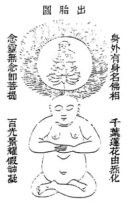 The text has survived in two editions: one in Zhang Junfang's Yunji Qiqian (雲笈七籤) and Xu Song's Quan Tangwen (全唐文), and another in the Daozang. A shorter Zuowanglun copy was inscribed on a stele erected on Mount Wangwu in 829.[36] Other relevant texts from Tang Dynasty masters (such as Sun Simiao and Wu Yun) associated with the Zuowanglun tradition include the Dingguan jing (定觀經; "Scripture on Stability and Observation, DZ 400"), the Cunshen lianqi ming (存神鍊氣 銘; "Inscription on Visualizing Spirit and Refining Qi, DZ 834"), the Neiguan jing (內觀經; "Scripture of Inner Observation, DZ 641") and the Tianyinzi (天隱子; "Book of the Master of Heavenly Seclusion, DZ 1026"). According to Kohn, The Tianyizi was widely published, and is still used among qigong practitioners today.[38] According to Kohn,[39] the Zuowanglun outlines seven steps in the progress of zuowang meditation:[40]
